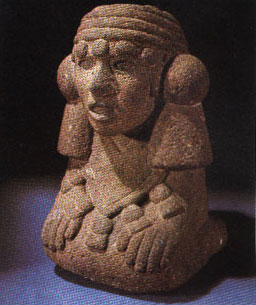 Chalchihuitlicue is the Aztec water goddess. Appropriately, she is the wife of Tlaloc, the rain god. Her name means "Lady Precious Green". She is a symbol of youthful beauty, shown in the picture by the style of her hair. Her headress signifies her status as a goddess, and is fringed with aramanth seeds. The tassels adorning her cape symbolize flowers, and she is squatting on her heels in a manner typical of Aztec women.